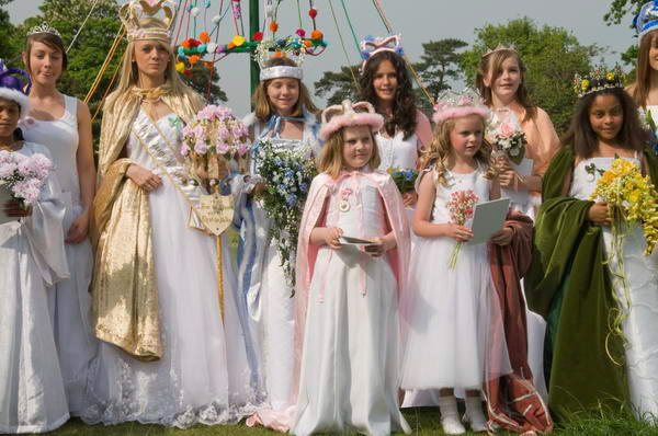 ![]() When all the realm May queens have been presented, they pose with the London May Queen in front of the maypole |
