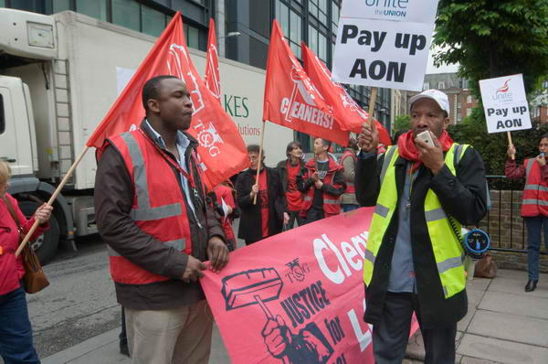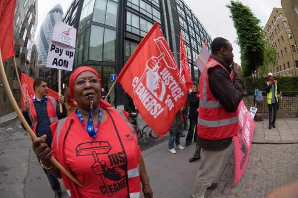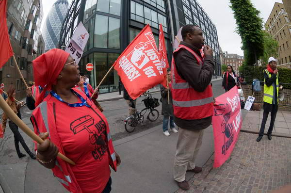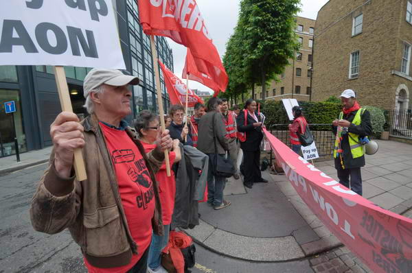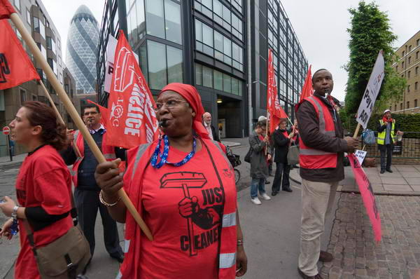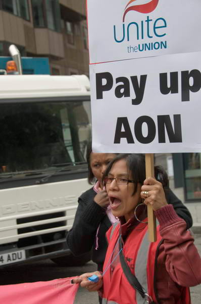 Justice for cleaners demonstrate at AON Devonshire Square, London. Thursday 15 May, 2008