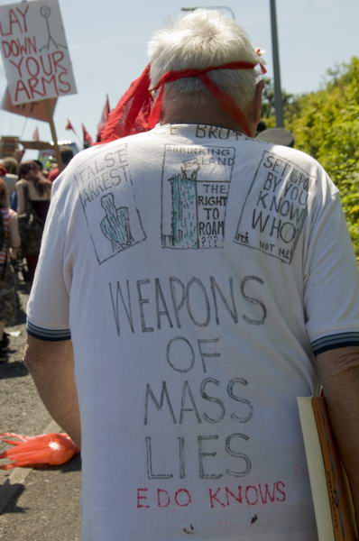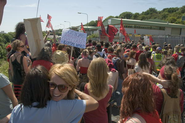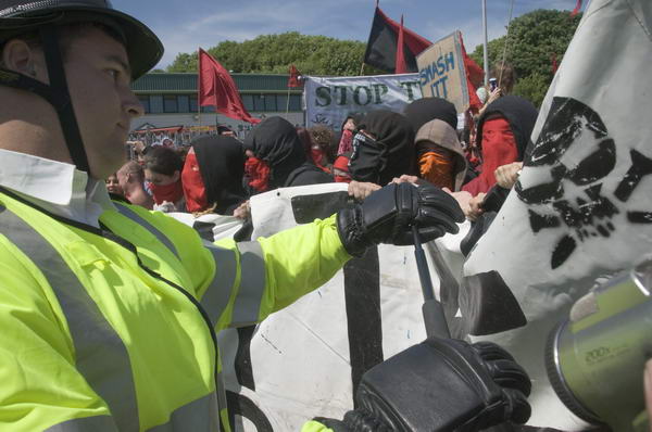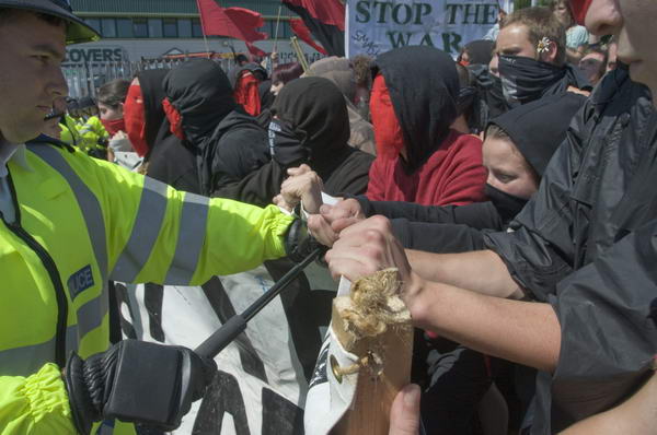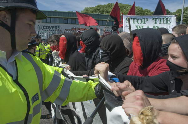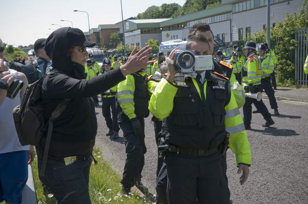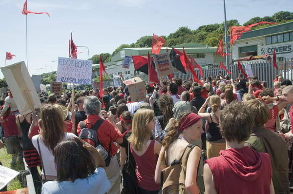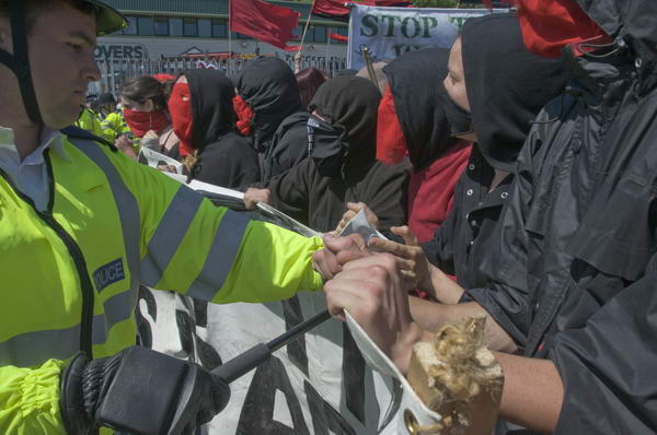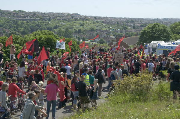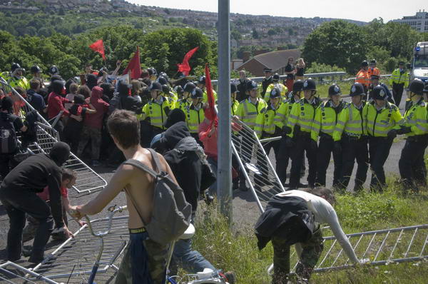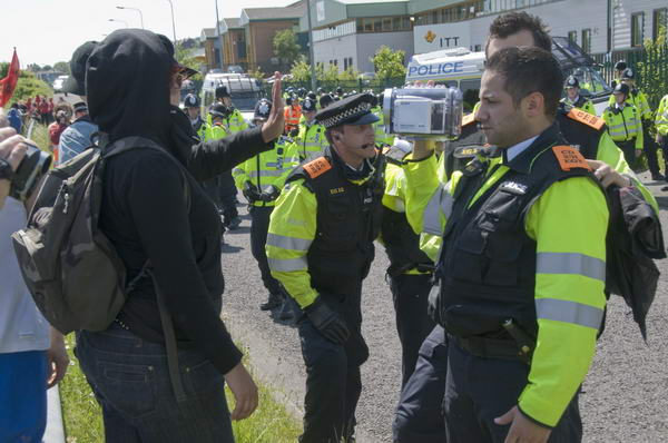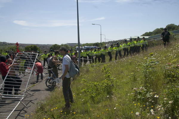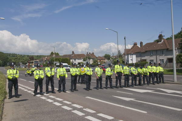Crash barrierd and a thin line fail to stop marchers on Home Farm Road and they continue towards EDO
