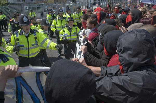 Police make another half-hearted attempt to stop the marchers but they swarm around the police vans.