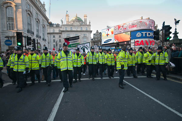 ![]() Police and stewards head the march as it goes down Regent Street |