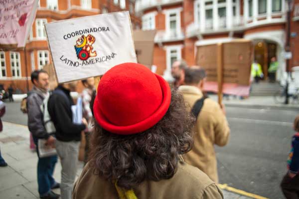 The protest was a part of a Global Mobilisation for Mother Earth called on the anniversary of Columbus landing on Abya Yala (the Americas), 517 years ago by the Coordinadora Andina de Organizaciones Indigenas (CAOI). In London the action supporting the 'Minga'- the collective mobilisation of people from along the Andes - Colombia, Ecuador, Bolivia, and Peru - marching together in their refusal to accept the destruction of their land was organised by the Coordinadora Latino-Americana which unites a number of Latin American solidarity groups here. It was in particular directed against the European Union's Free Trade agreements with Latin American countries which will allow multinational companies to exploit resources on favourable terms, with deals by Colombia and Peru that will destroy the ancestral territorial rights or indigenous peoples and also isolate the more progressive governments in the area, but at each of the embassies it called at there were also specific demands related to the situation in each country.