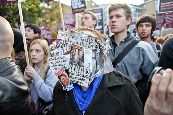 A woman with her face covered with newspaper cuttings about the BNP and Griffin