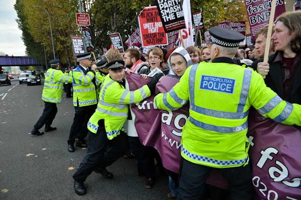 Police try to prevent protest going on the the street