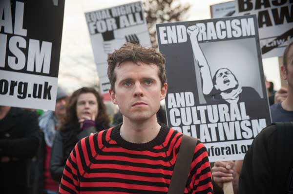 One Law For All is careful to distance itself from the various right-wing anti-Muslim groups and Maryam Namazie, the main speaker for the organisation has consistently opposed groups such as the English Defence League. There were just one small group of protesters at the event with a St George flag present for a part of the demonstration.