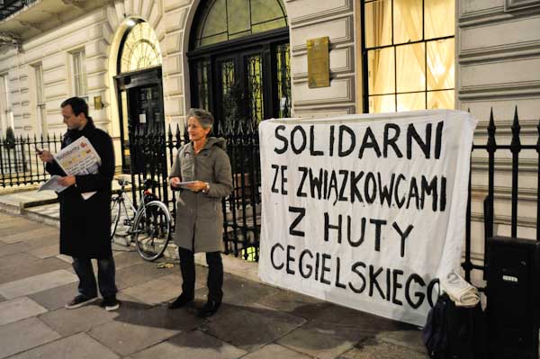 At a protest there a few days earlier, a letter was delivered to the ambassador from the British Isles Regional Organising Committee of the Industrial Workers of the World which has a formal solidarity alliance with the Workers' Initiative trade union in Poland.
