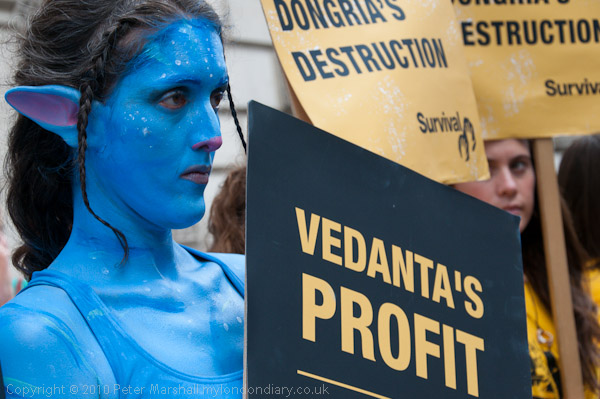 Among the demonstrators were actors from the James Cameron film 'Avatar' and there were two bright blue aliens from the tribe destroyed in in that film. Vedanta has already built an aluminium refinery in Lanjigarh amd has carried out preliminary work for bauxite mining in Orissa's Niyamgiri Hills which will destroy the ancient civilisation of the Dongria Kondh adivasi community for whom these mountains and forests are Gods.