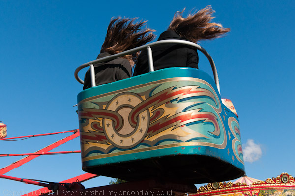 On Sunday we took our guests for a pub lunch (they turned down the English food on the menu we had taken them for and both had continental dishes) and then (eventually) caught a bus to Carter's Steam Fair on the green at Englefield Green. They enjoyed their ride on the Octopus, though I'm rather glad I didn't try it. It was hard enough trying to keep up with it looking through a camera, though the Nikon autofocus did a pretty impressive job - I could only have got the occasional picture sharp with manual focus, while almost every frame here was sharp.