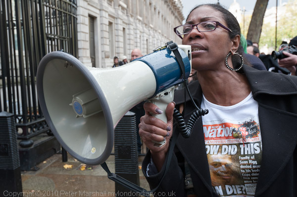 Marcia Rigg-Samuel, sister of Sean Rigg, who went into Brixton Police station in August 2008 a physically healthy man but was dead a short time later, killed by the actions of a small group of officers, led the procession down Whitehall from Trafalgar Square. She stood beside her sister, Samantha Rigg-David, the last of the families to speak, and then read the letter from the families to Prime Minister David Cameron. The inquest on Sean Rigg, adjourned in 2008, is not now expected until 2012.