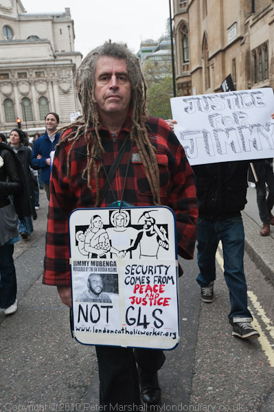 A man from London Catholic Workers with a placard 'Security Comes from Peace and Justice NOT G4S'