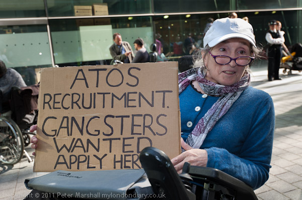 'Atod Recruitment. Gangsters Wanted. Apply Here' and 'Atos Don't Give A toss' banner outside the offices