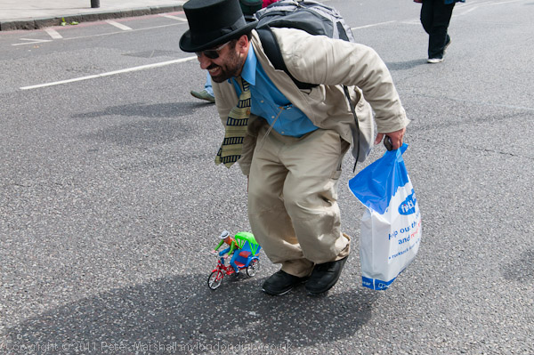 A character who walked in front of the march with a toy amusing the children and leaving flowers on the road for them