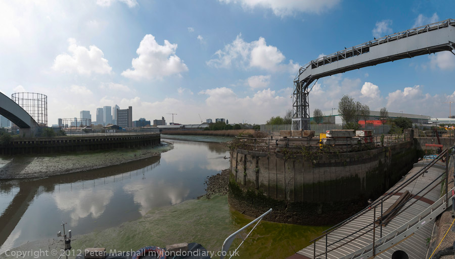 We met on Sunday morning at Pudding Mill Lane station and walked up the Greenway to Hackney Wick, through Fish Island to White Posts Lane. i'd arrived half an hour or so early and had taken a couple of panoramas before the others arrived. It was by then getting a little late, so after a short while there went across the bridge over the navigation and back down to Old Ford Lock. Because the path up to the Greenway beyond there is closed we then had to go across the lock and walk to the start of the Greenway to make our way back to the View Tube.