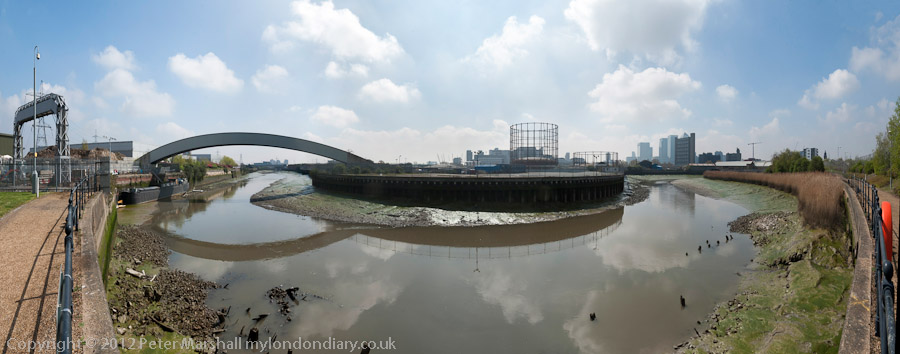 Bow Creek just outside Cody Dock, with the holders of Poplar gas works on the left and Canary Wharf in the distance behind Goldfinger's Balfron Tower