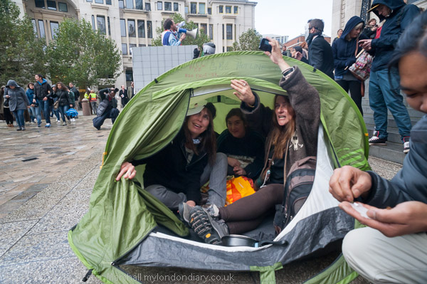 Outside a small group were sheltering in a tent, though the rain had more or less stopped