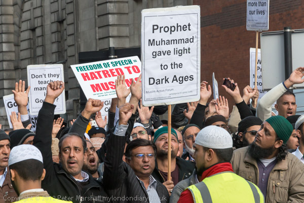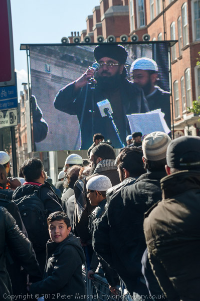 At first the protest was in one carriageway only and a large pen was filled with Muslim men, with speakers and screen at the far end