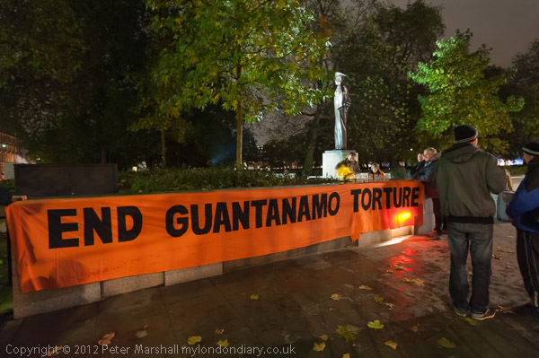 and on the wall in front, a large banner 'End Guantanamo Torture'