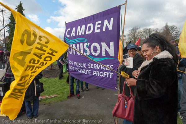 Local protests, now led by the North East London Council of Action, have continued, with daily pickets outside the hospital where the units are due to close this November. The march was also supported by the Save Chase Farm campaign and the London Fire Brigade Union as well as Unison and there were a couple of people with a banner from another North London hospital, the Whittington Hospital at Archway, where vigorous local protest stopped closures of A&E and maternity a few years ago, but where the management is again proposing cuts.