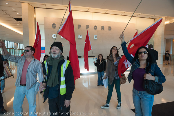 the protesters wave flags and show their banner inside
