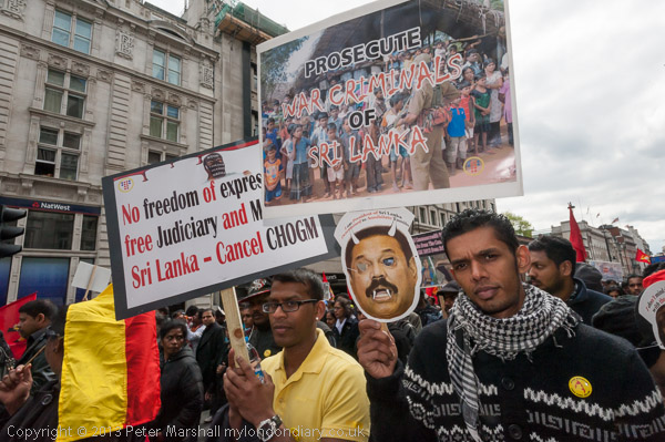 Many protesters wore masks showing the face of Sri Lankan President Mahinda Rajapakshe with fangs and horns