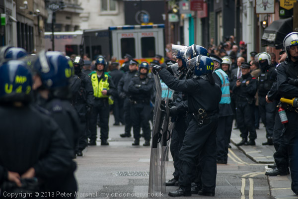 The police with riot shields were opposite the front of the building. Inside were a fairly small number of peaceful protesters, including some children
