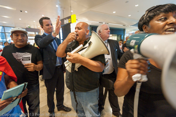 Waiting for them outside John Lewis were a small group of Westfield Security who had little success in preventing them continuing the protest, though they eventually persuaded them to move out of the enclosed 'street' into the open air. There was a little pushing by security, and one man several times attempted to put his hand over my lens, telling me I'd taken enough pictures, but I couldn't agree.