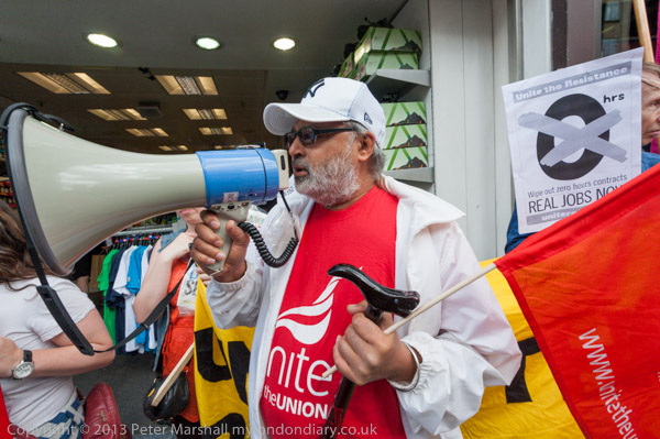 Protesters lined the pavement outside Sports Direct in the Plaza shopping centre on Oxford St