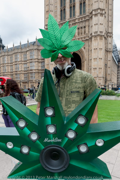 A man in a cannabis leaf mask with a cannabis leaf loudspeaker system