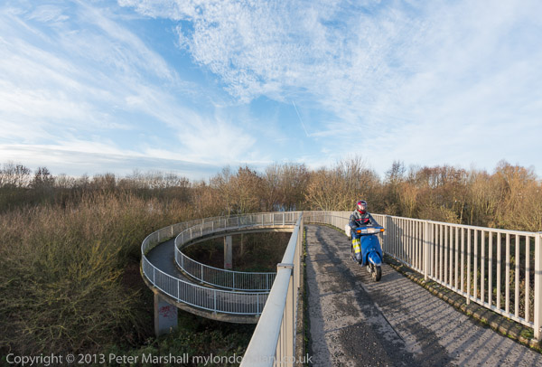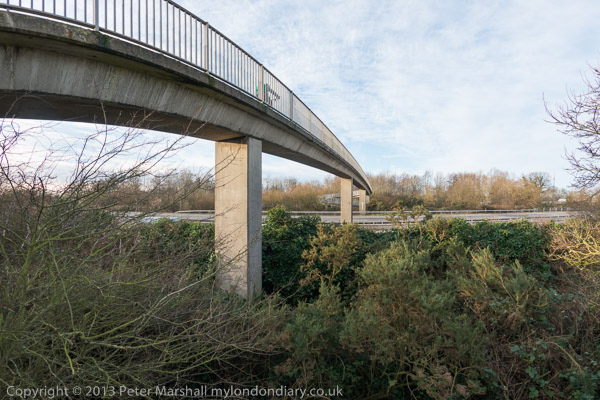 ![]() ![]() ![]() ![]() ![]() On the other side of the motorway is a nature reserve and former gravel workings ![]() Cycling is not permitted on the footbridge ![]() ![]() ![]() A few yards past the motorway the footpath crosses the River Ash which goes under the M3 here ![]() A second bridge across the Ash to the nature reserve ![]() ![]() |