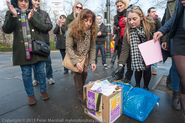 People put their bellyhangers and messages into a box to be taken to the Spanish Embassy