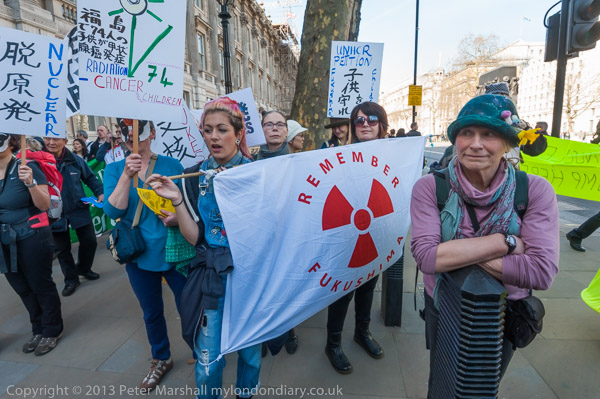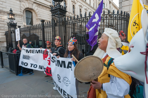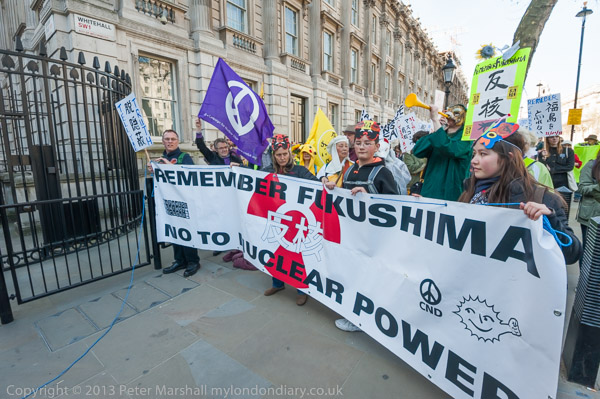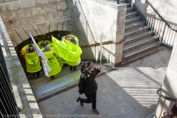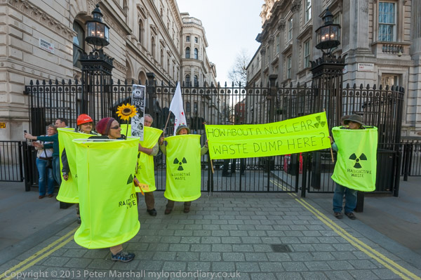 'How About A Nuclear Waste Dump Here?' at Downing St. The protesters went on to a rally opposite Parliament