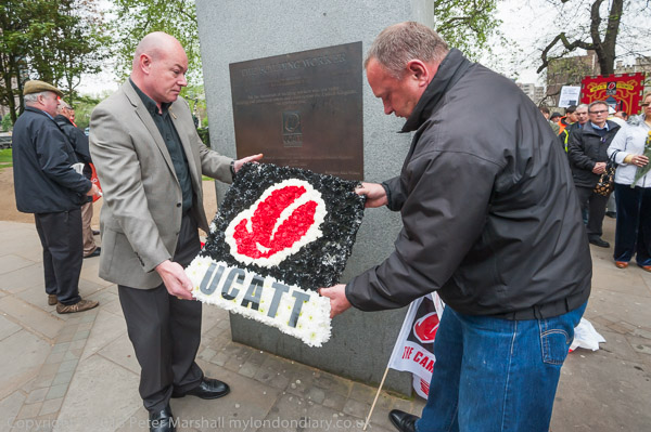 The UCATT wreath is laid at the base of the statue of the Building Worker