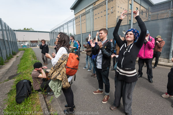 People waved at the prisoners, and some were able to speak to those inside Colnbrook and Harmondsworth