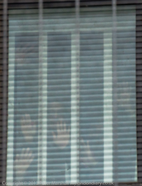 We could vaguely see a lot of hands and very dim faces in the windows. As well as the grid of the fence there is a layer of dirty glass and another of plexiglass between them and us.
