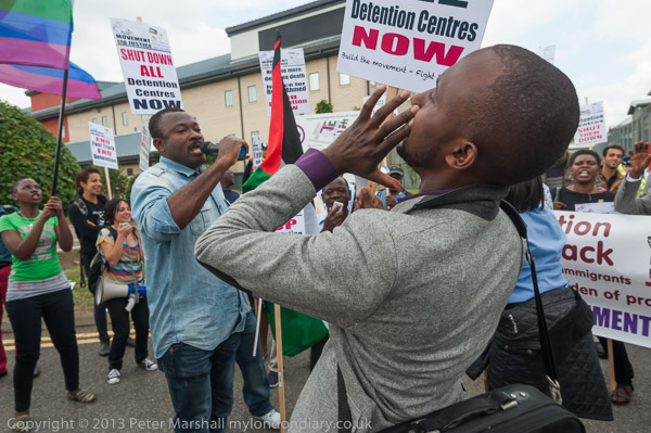 The protest at the embassy in Notting Hill was attended by around 40 people from the Metropolitan Community Church, the Out & Proud Diamond Group and the Peter Tatchell Foundation, with Peter Tatchell himself taking part. There was a great deal of loud drumming, shouting and dancing on the road and pavement in front of the protest.