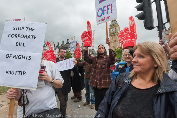The protest, backed by groups including War on Want, the World Development Movement and Occupy London was organised at very short notice. The negotiations over CETA (Canada and European Union (EU) Comprehensive Economic and Trade Agreement) as with its wider equivalent TTIP (Transatlantic Trade and Investment Partnership) have been carried out in secret, with great care being taken to avoid any leaks and the documents are to be withheld for 30 years. Two weeks ago a protest delivered a letter to the ministers at the Department for Business, Innovation & Skills including Vince Cable, calling for the finalising of CETA to be delayed and asking for his responses to their concerns; this has been completely ignored - not even acknowledged.
