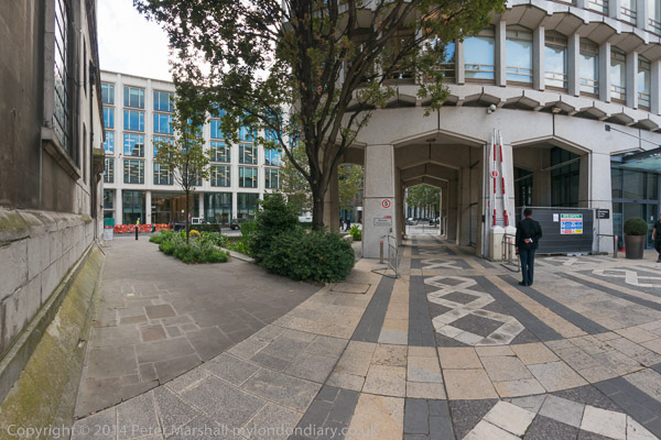 Bassetlaw Highwalk, Basinghall St and Basinghall Avenue. The Highwalk is blocked by gates under City Place House