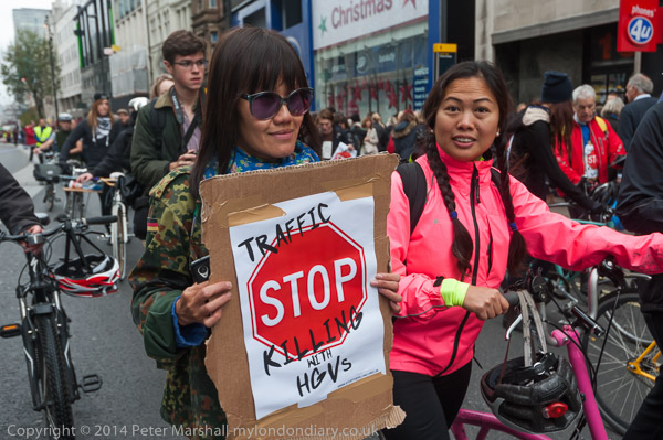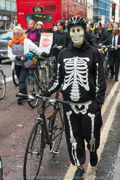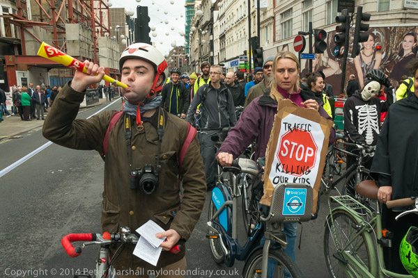 ![]() The carriage containing the coffin reflects the main banner ![]() 14 cyclists were killed in London in 2013 - mostly when vehicles turned left over them ![]() Big lorries are the main things that kill cyclists. 30% are dangerously defective, but the laws are not enforced ![]() A skeleton on the funeral march ![]() 'STOP Traffic Killing our Kids' ![]() 'STOP Traffic Killing with HGVs' ![]() Donnachadh McCarthy holds a poster'DTOP Traffic Killing with HGVs' at the head of the procession in Oxford Circus |