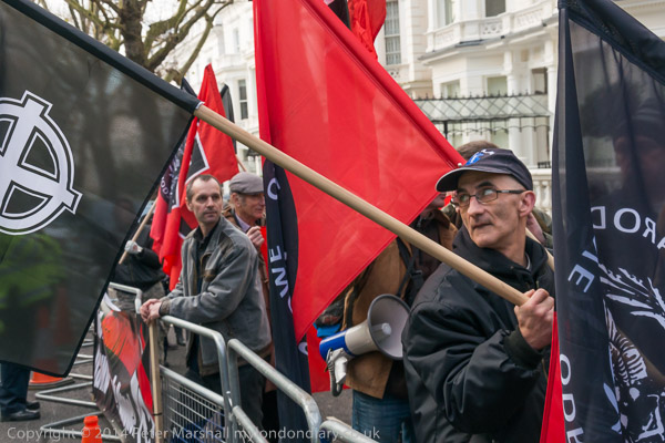 The view from the Greek Embassy of the two groups, neo-Nazis at left, anti-fascists at right, police in the middle
