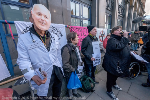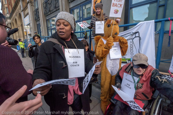 One of the Maximus job coaches was dressed as a squirrel, with a placard 'Nuts to IDS - Squirrels fight back'