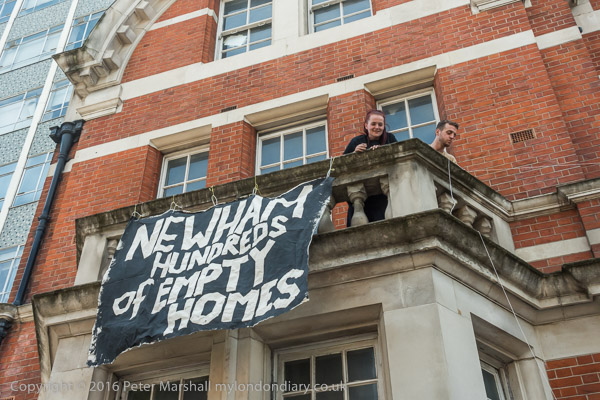 One of the balcony banners 'Newham - Hundreds of Empty Homes' - on the Carpenters estate homes in good condition have been empty over 10 years