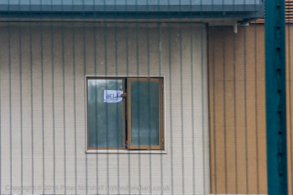 A sign in the window simply says 'HELP'. The windows only open a short distance. The prisoners can hear and we can hear them shouting