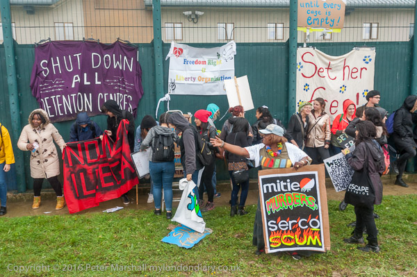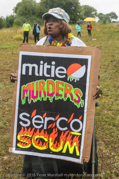 A woman holds a poster condeming two of the private companies that run our immigration prisons 'mitie murders - serco scum'