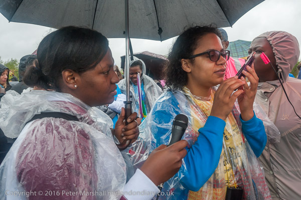 At times the rain slackens a little, and some put down umbrellas,