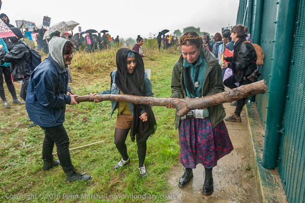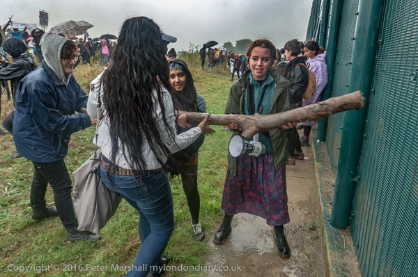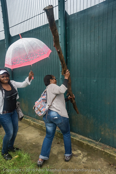 People found a tree branch and used it to bang the fence