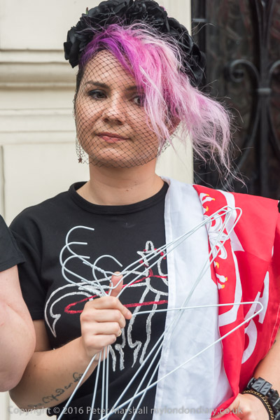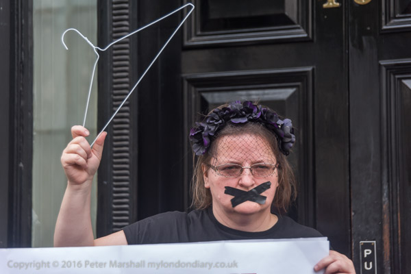A feminist holds wire coathangers which were often used in illegal abortions - and often caused permanent injury or death