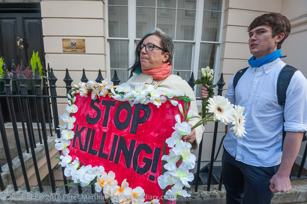 Activists share out white flowers to carry to the embassy