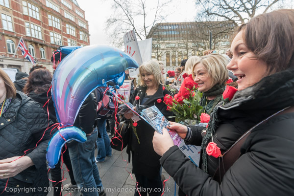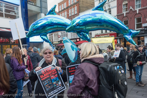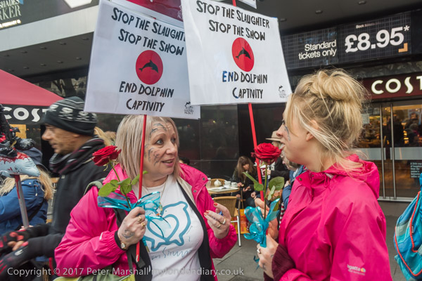 Protesters brought dolphins and red roses