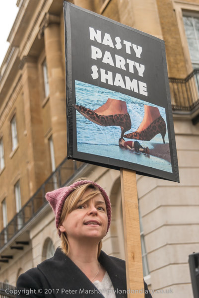 A poster shows Theresa May's high heels treading on a child with caption