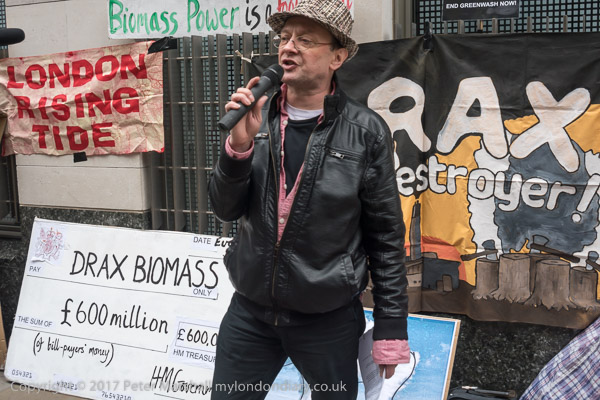 Environmental campaigners from Biofuelwatch, Axe Drax and London Rising Tide protest outside the offices of Schroders and Invesco, the major shareholders in Drax, the UK’s largest and most polluting power station.